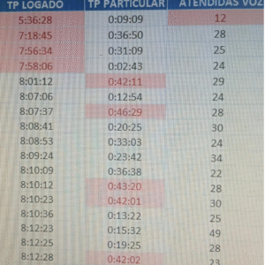 Maria explica que dentro da empresa existe uma tabela de feedbacks para contabilizar todos os horários dentro da rotina do trabalhador. “‘TP logado’ é o tempo que a pessoa está trabalhando. ‘TP particular’ são os intervalos garantidos por direito, duas de 20 minutos para jornada de seis horas, e uma hora para a jornada de oito horas. ‘Atendidas voz’ são a quantidade de ligações que foram atendidas no dia”.