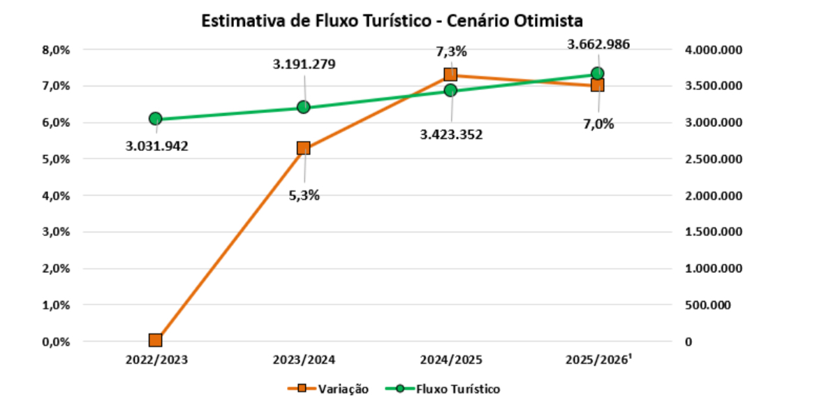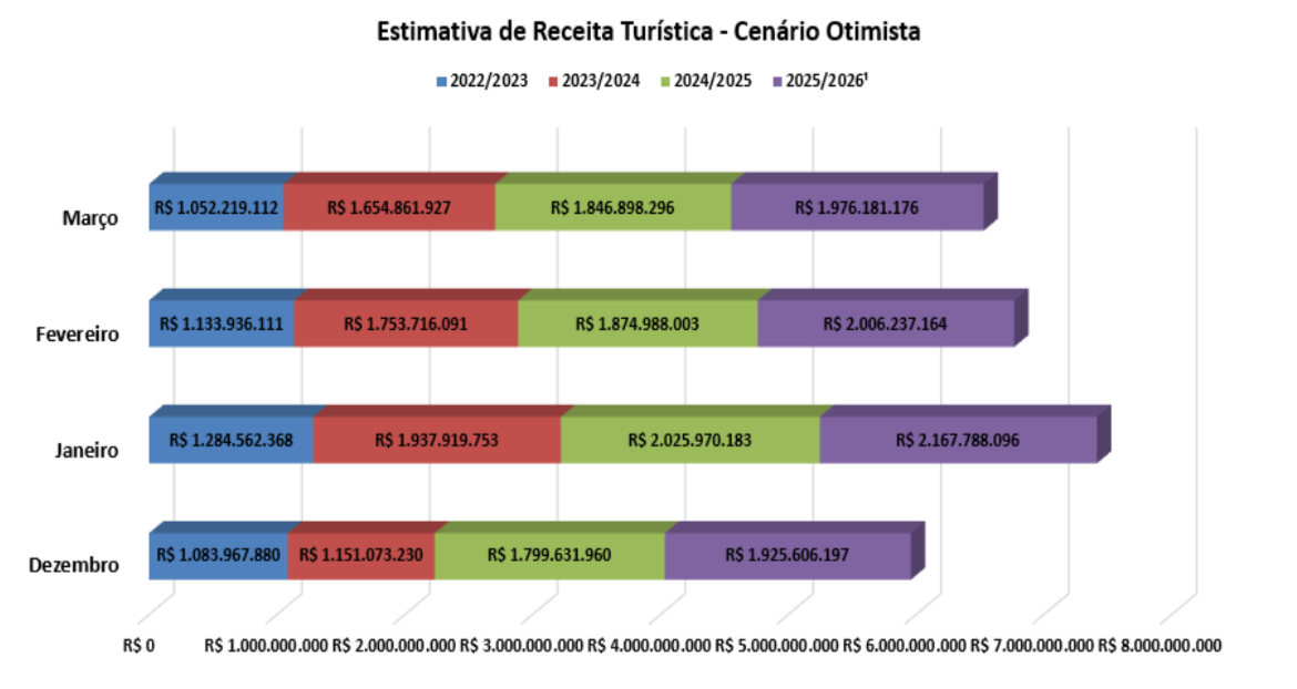 Neste cenário, a receita a ser gerada em 2026 seria de R$8 bilhões, montante superior ao Verão de 2025 em cerca de R$528 milhões. Caso consolidado, o lucro gerado pelos visitantes aos cofres municipais será de R$1,6 bilhão maior do que o verão de 2023/2024.